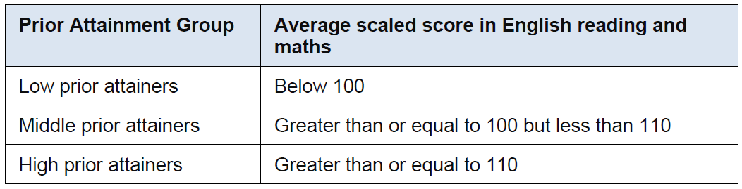 Once the tests have been marked, government bean counters pore through the results and come up with scaled scores for each pupil. In true bureaucratic desire to categorise everything and everyone, the scaled scores are then used to label each pupil as high-, middle-, or low-attaining. On page 25 of the DfE’s guidance on secondary accountability measures, there is a table that defines this process.