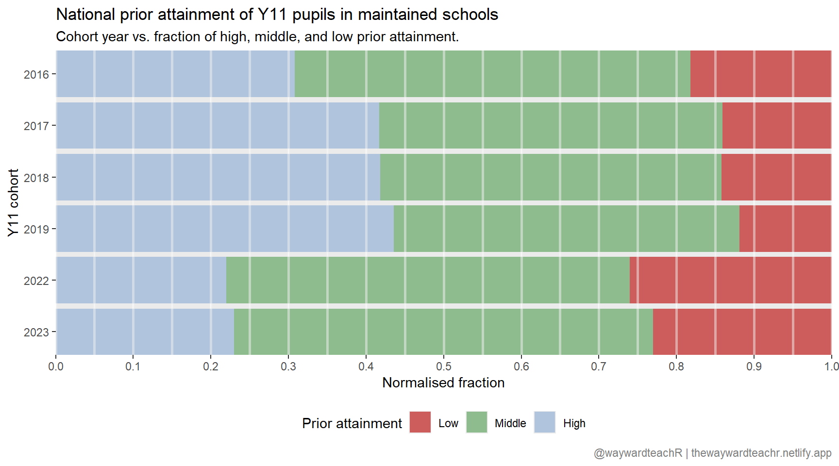 Note the missing cohorts and the marked difference in percentage prior attainment on going from 2019 to 2022 (due to the new method of testing (scaled scores)).
