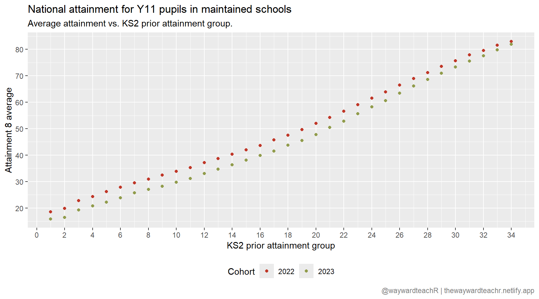 For every KS2 prior attainment group, it appears that the 2023 cohort’s average attainment was lower than that of the 2022 cohort. The politics of why this is the case will be familiar to those in the education game: after three years of grade inflation, the government made good on their promise to realign grades in line with the pre-pandemic 2019 cohort. The only way of doing this is by lowering attainment.